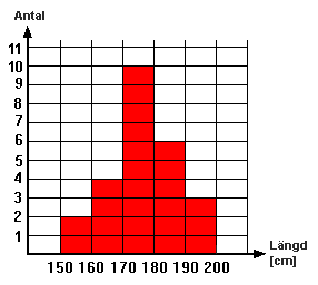Vi ska börja med att göra ett histogram över materialet och sedan beräkna ett medelvärdet av längderna. När vi gör ett histogram börjar vi med att bestämma klasserna som vi ska sortera in materialet i. Minsta värdet är 158 cm och största 197 cm. Då väljer vi klasser med 10 cm bredd med början från 150 cm. Klasserna blir: 150 - 160, 160 - 170, 170 - 180, 180 - 190 och 190 - 200. Till klassen 170 - 180 räknas 170 men inte 180.